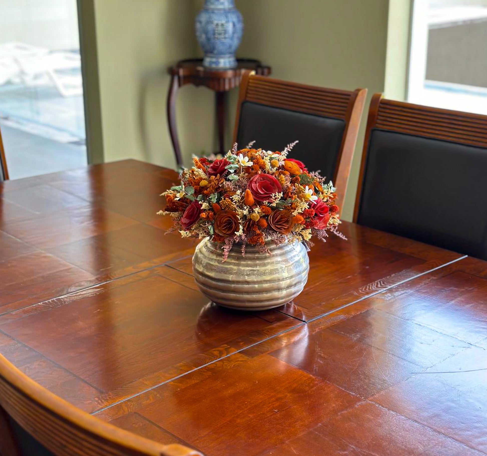 Hermoso y frondoso arreglo floral diseñado para verse por todo los lados con flores secas y preservadas que no necesitan agua y no se marchitan