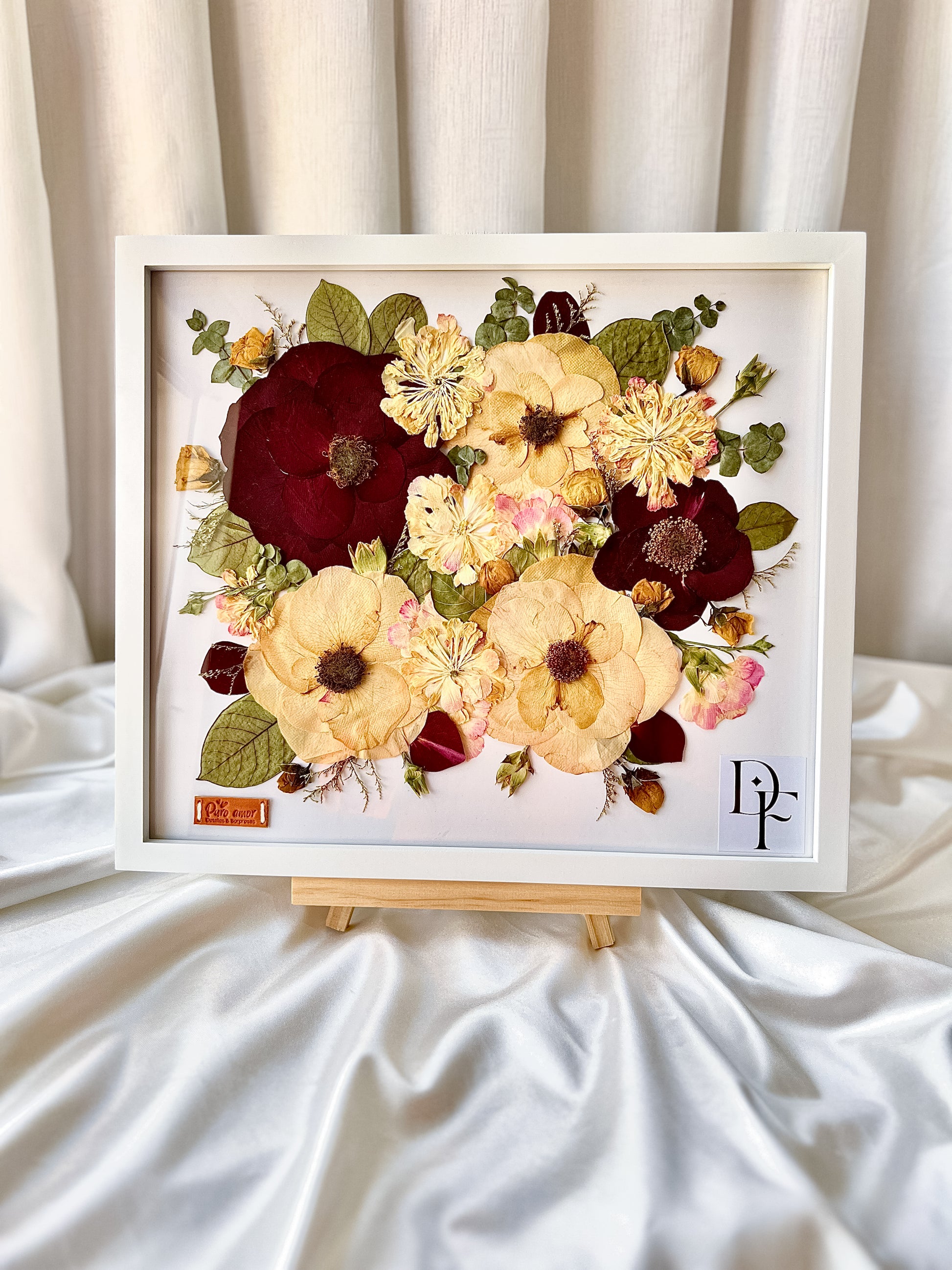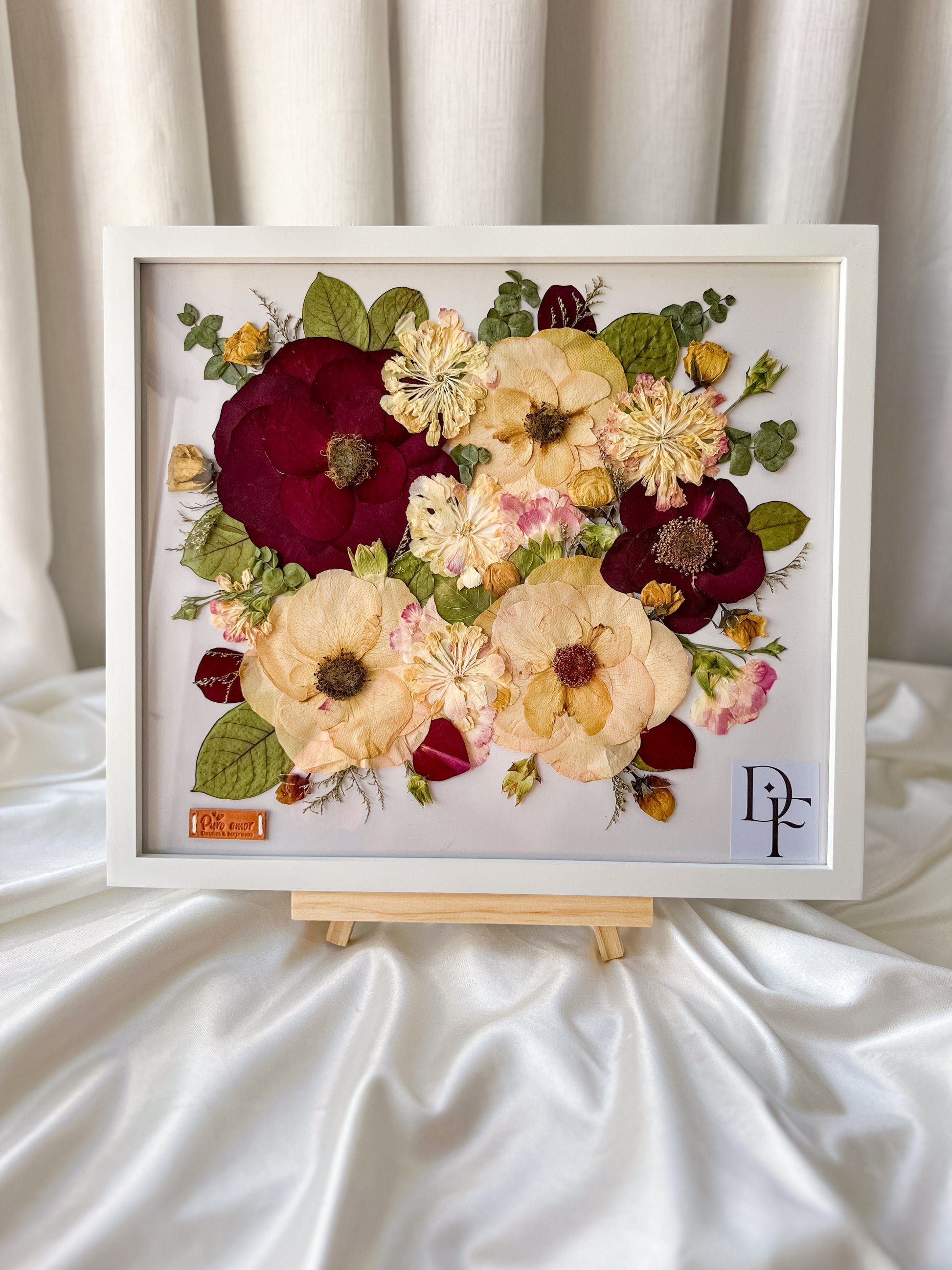 Reserva la fecha después de un día de tu boda para poder pasar por tu bouquet y botonier del novio. Durante 4 semanas nosotros nos encargamos de hacer la magia para luego entregarte en este cuadro hermoso tu ramo y botonier eternizado.