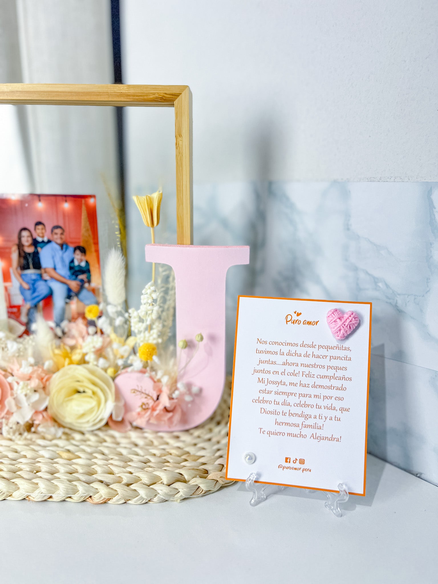 Incluye: Letra inicial, tarjeta de dedicatoria personalizada, tarjetita con los tips y cuidados más una cajita de regalo