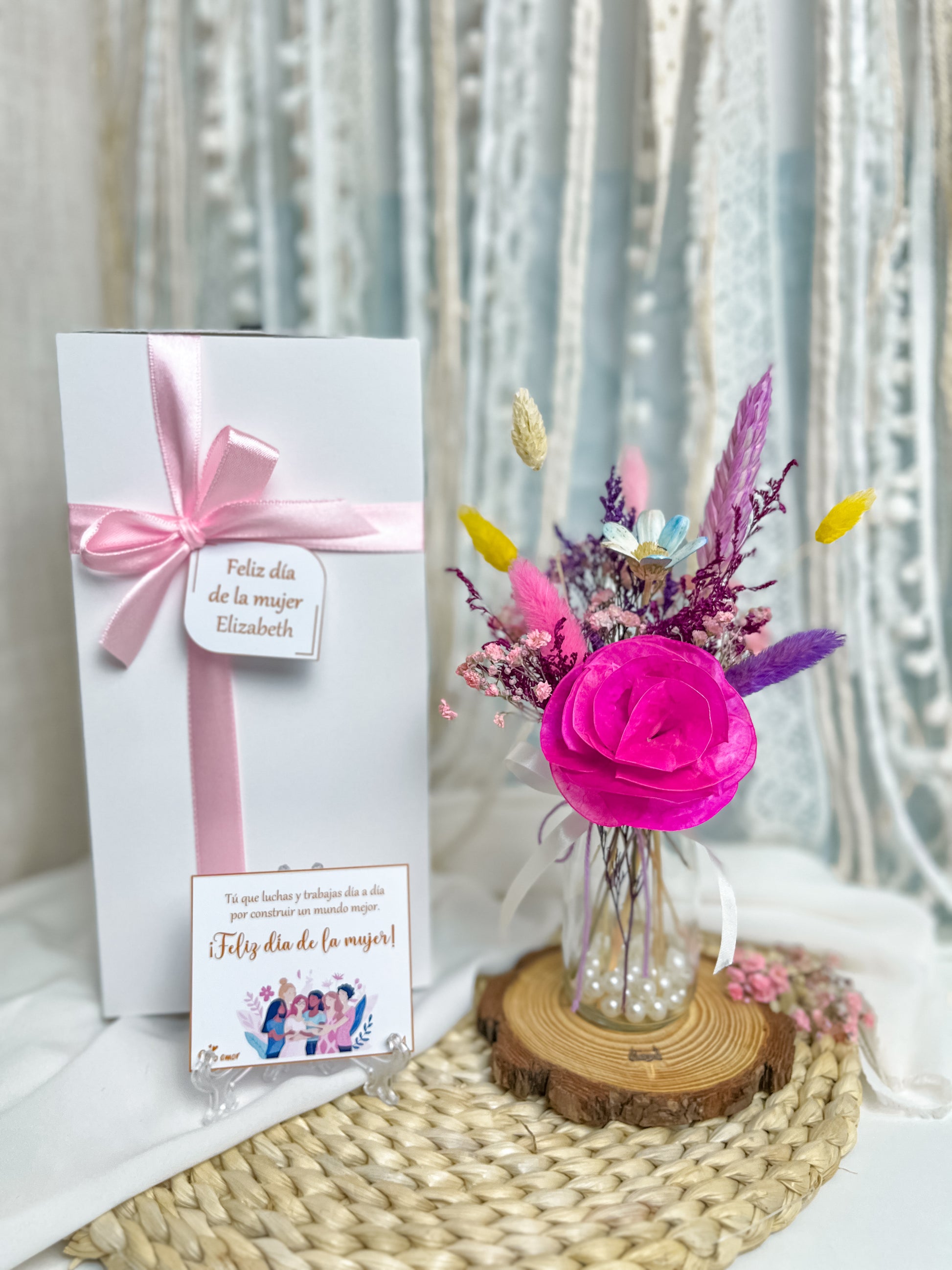 - Incluye caja decorada con lacito en combinación