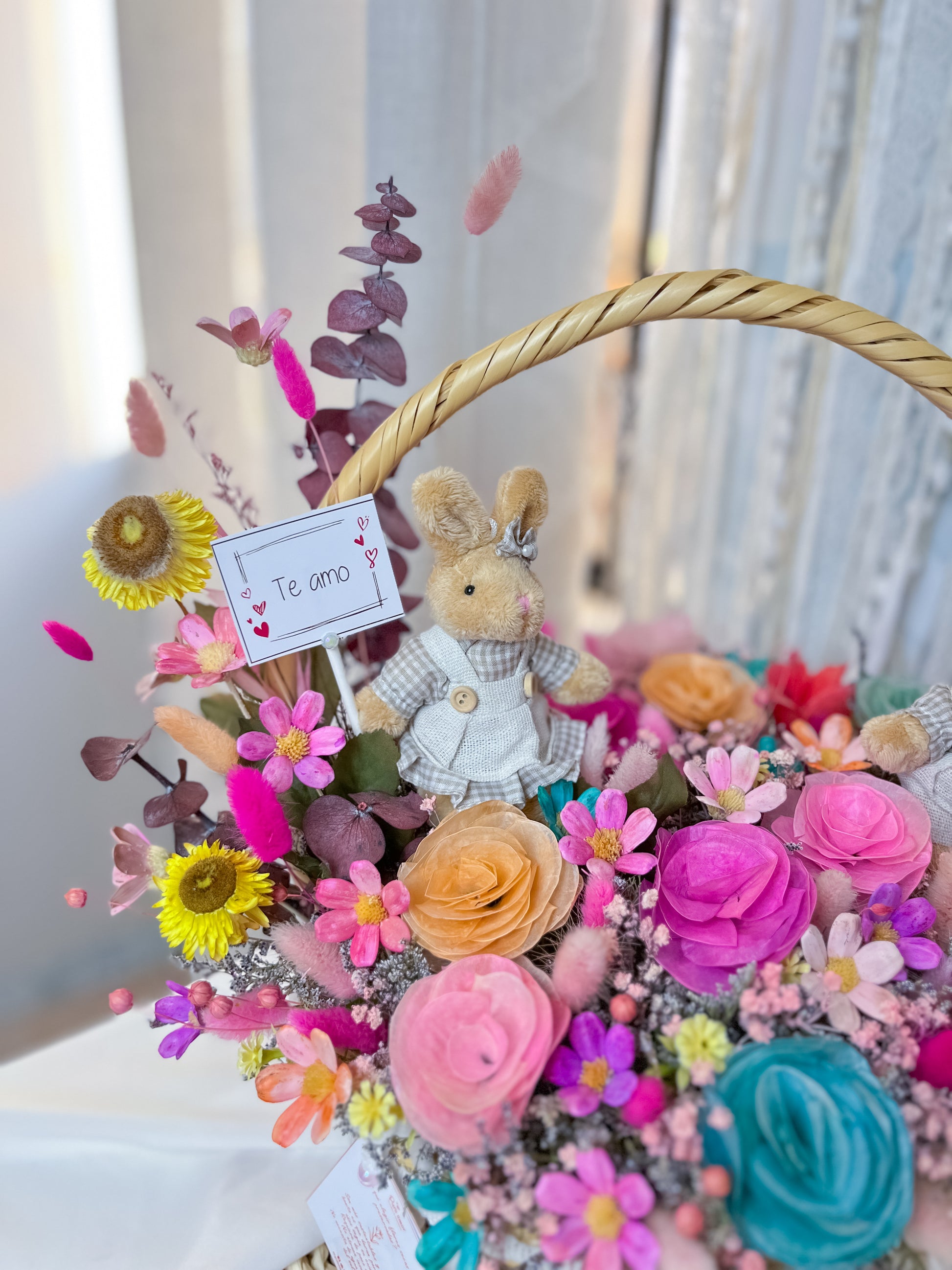 Canasta silvestre elaborado con rosas de lunaria, texturas y colores que transmiten amor duradero. Esta obra de arte con flores naturales que pasaron por un proceso de secado y preservado para que te duren por muchos años es ideal para sorprender y cautivar a esa persona tan especial.